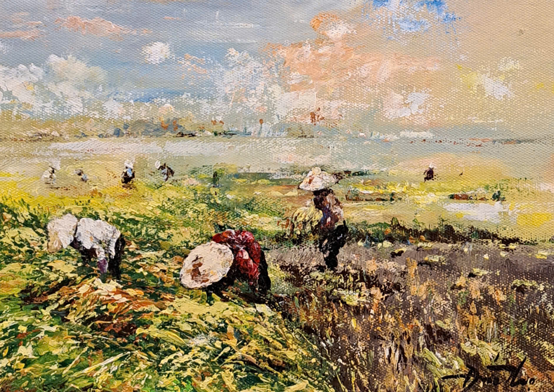 His paintings focus on rural life and agricultural landscapes, particularly rice fields, harvest seasons, and the daily activities of farmers. Drawing from childhood memories and lived experiences, Duc Tho's works convey a deep emotional connection to the countryside and a sense of quiet resilience in ordinary life.